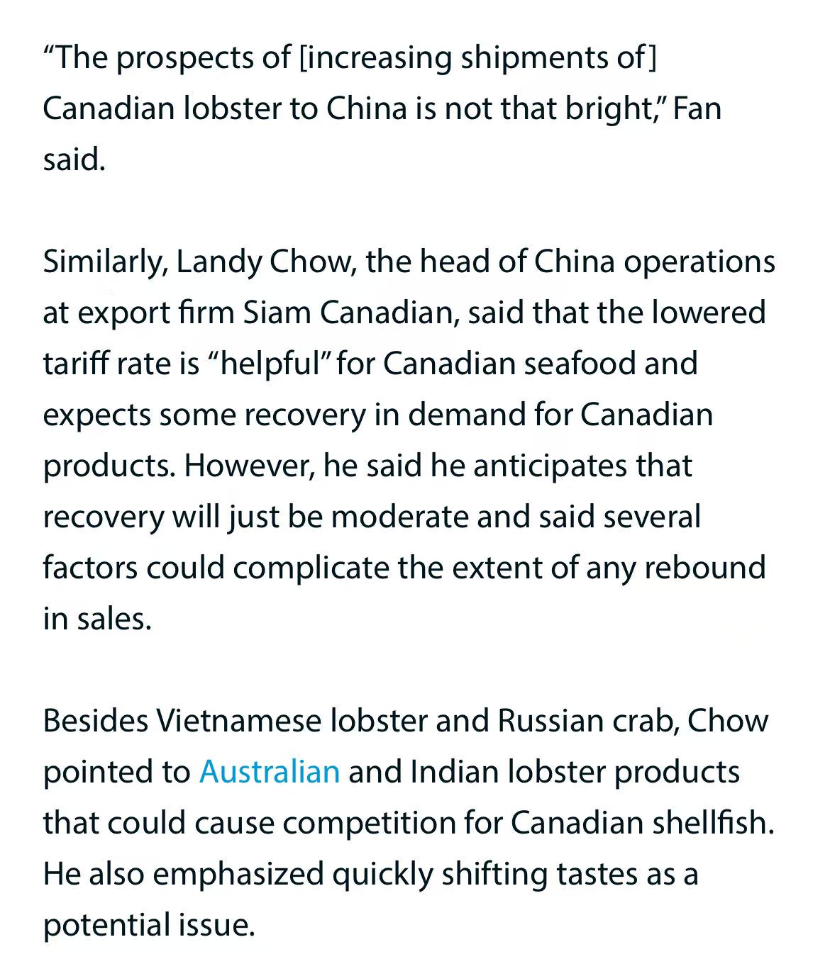 整体来看,关税取消提供了准入机会,但加拿大海产品能否真正“回归”,仍需在市场中进行艰苦竞争。