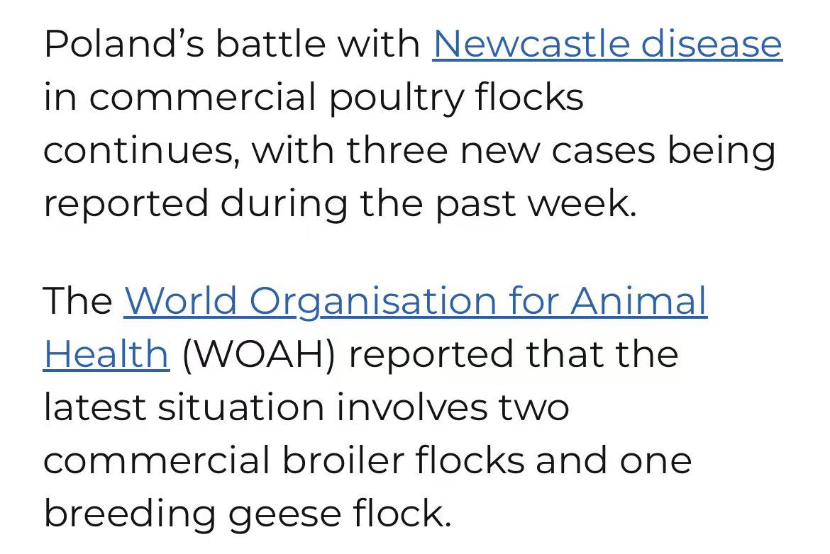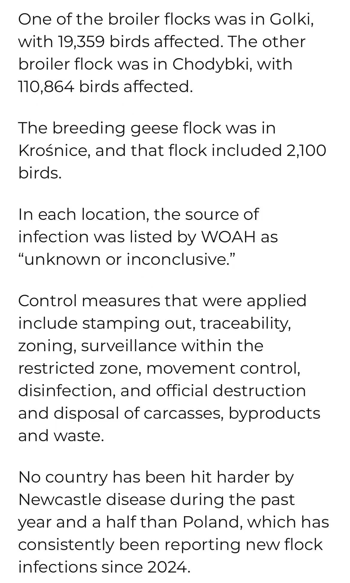 波兰新城疫疫情持续,三起新病例涉及超13万只家禽。据世界动物卫生组织通报,近期两个商业肉鸡群与一种鹅群暴发疫情,感染源尚未明确。当局已实施扑杀、分区管控、移动限制等防控措施。