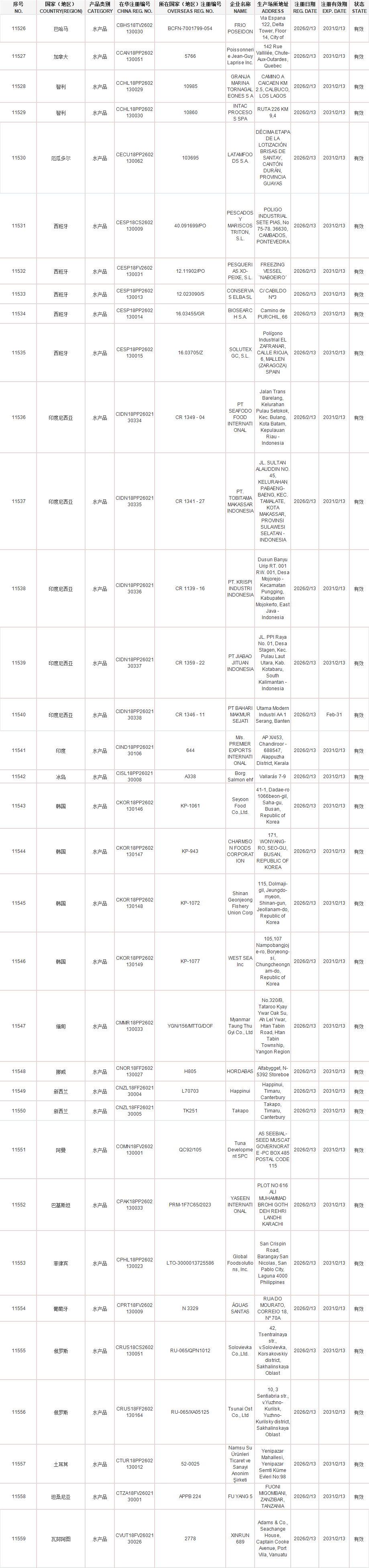 16.海关总署新增葡萄牙1家水产品企业输华注册(注册编码为:N 3329)自2026年2月13日(含)后生产的输华产品进口准入。