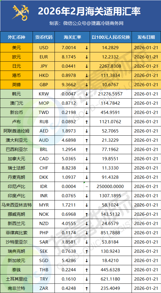 根据《中华人民共和国海关进出口货物征税管理办法》(海关总署令2005年第124号)第十六条的规定,海关每月使用的计征汇率为上一个月第三个星期三(第三个星期三为法定节假日的,顺延采用第四个星期三)中国人民银行公布的外币对人民币的基准汇率;