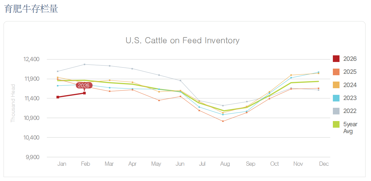 存栏能力1,000头及以上的美国育肥场中,育肥牛存栏总量为1,150万头,较去年同期下降1.8%。1月份补栏量174万头,同比下降5%,同期出栏量163万头,同比下降13%。