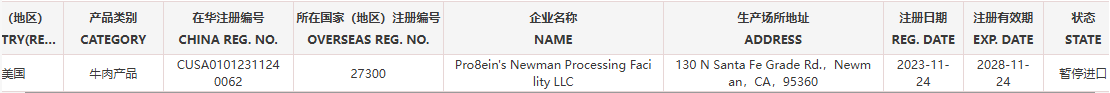 暂停受理美国1家牛肉企业(注册编码为:27300)自2026年3月2日(含)起启运的输华产品进口申报。