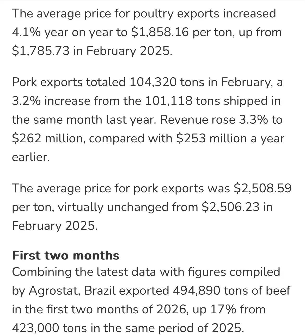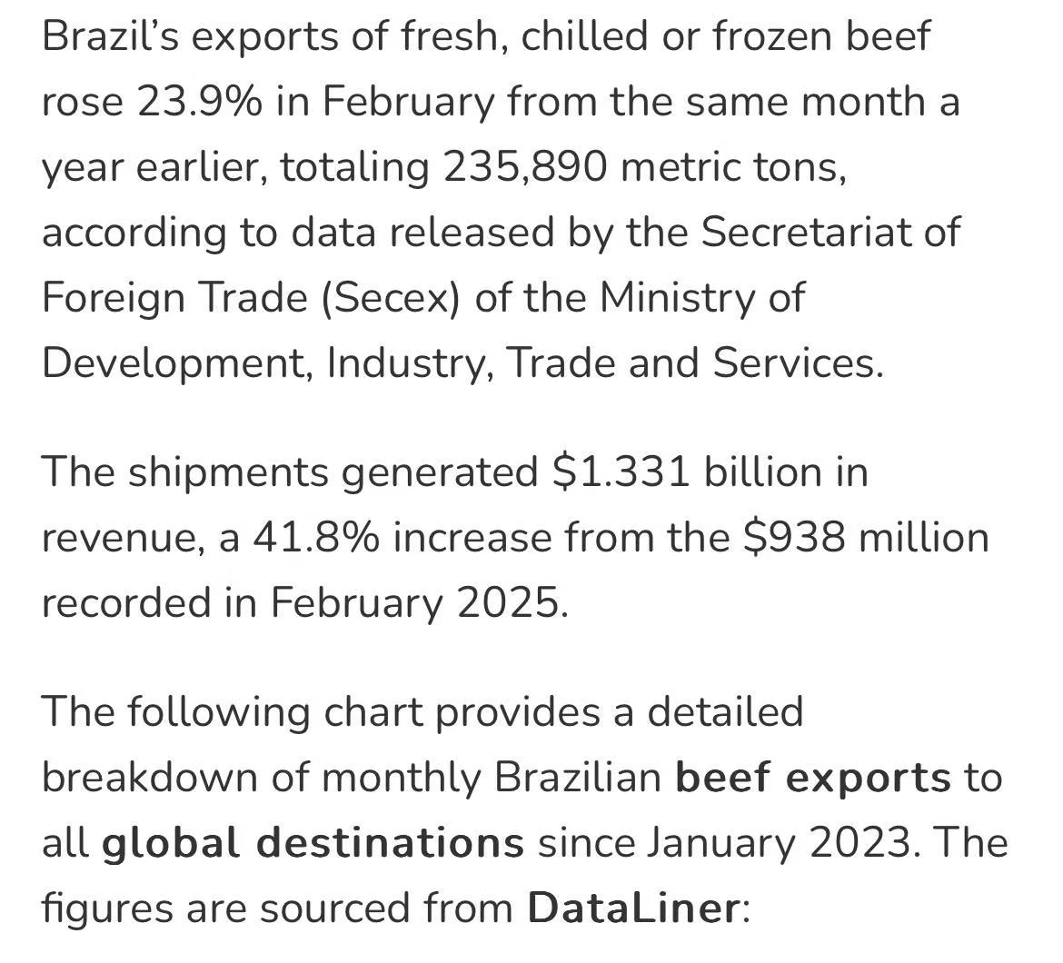 巴西外贸秘书处(Secex)最新数据显示,2月巴西牛肉出口延续强势。