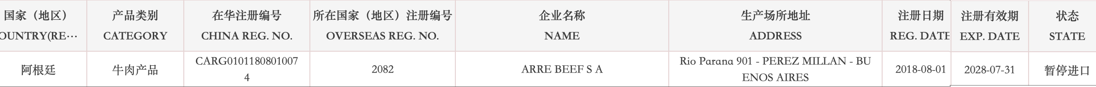 暂停受理阿根廷1家牛肉企业(注册编码为:2082)自2026年3月19日(含)起启运的输华产品进口申报。