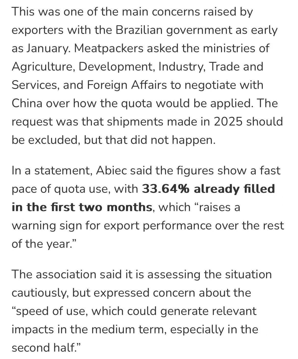 ABIEC表示,配额使用速度过快“为全年出口表现敲响警钟”,呼吁巴西政府建立官方配额管控机制,包括按企业过往份额分配、季度发放、月度监测等建议,以避免前期集中发货、后期无货可发的局面。
