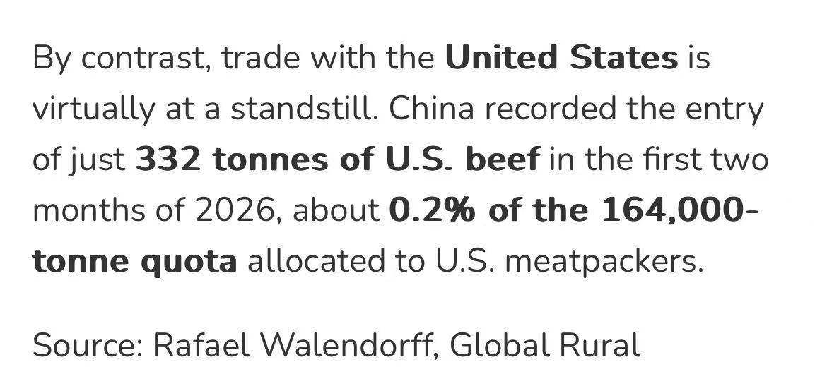 第三,美国份额几乎空白,意味着原本流向美国的牛肉需求可能会转向其他市场,进一步加剧配额紧张。这是全球层面的连锁反应。