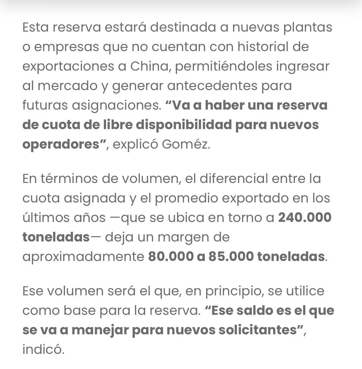 分配机制延续自2003年以来的成熟模式:老牌屠宰厂按过去三年对华实际出口业绩分配,近三年年均约24.5万吨。剩余的约8万吨配额将设立“储备池”,专门分配给没有对华出口历史的新工厂(如刚复产的365厂、22厂等),帮助其建立业绩记录。