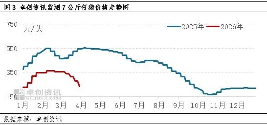 从历史数据看,一季度到二季度初通常为仔猪补栏旺季,价格多震荡上升,但2026年此阶段仔猪价格先涨后降。截至4月14日,卓创资讯监测2026年全国7公斤仔猪市场价为302元/头,较2015年同期下跌38.79%。从仔猪市场的需求来看,2026年生猪价格突破新低,养殖盈利每况愈下,导致养殖端补栏仔猪积极性较低,多数养殖场处于观望状态,仔猪补栏需求减少。从仔猪的供应来看,从3月中旬左右开始,部分养殖端销售仔猪已处于亏损状态,但据卓创资讯调研,多数养殖端为缓解存栏压力与现金流压力,销售仔猪相对积极,仔猪供应充沛,价格下滑。