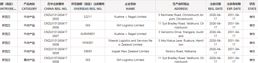 新增新西兰5家牛肉企业和1家鹿肉企业(注册编码为:S2211、S65、S9693、KUEHNE01、MSK001)自2026年4月17日(含)后生产的输华产品进口准入。
