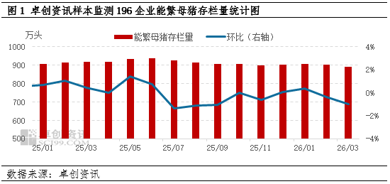 卓创资讯196样本企业能繁母猪存栏量于2025年7月份出现下降趋势,7-9月份环比降幅均在1%以上。进入2026年,养殖亏损持续,导致养殖端仍处于去产能状态。