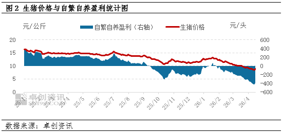 生猪自繁自养于2025年9月15日进入亏损状态以来,仅在2026年1月中旬短暂实现盈利,其余时间均处于亏损状态。截至4月16日,4月份自繁自养头均亏损378.54元/头,达到本轮亏损周期的最高水平。生猪养殖亏损周期长达半年之久,养殖企业资金压力加重,且行业长期处在产能过剩状态,加速养殖端产能去化脚步。