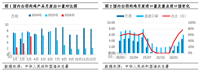 【导语】2026年一季度国内鸡肉进口量逐月增加,前期巴西进口受限,总进口量同比跌幅大,冻鸡爪、鸡翼进口量同比走低,多国供给同步收缩。二季度巴西鸡肉产能释放,带动国内鸡肉进口量稳步回升。同时市场多空因素交织,南美禽流感疫情反复、外部进口渠道收缩形成底部支撑,而5月起烧烤、快餐等季节性餐饮需求回暖,一定程度对冲前期淡季拖累及进口增量带来的供给压力,预计二季度鸡副产品供需趋于平衡,行情震荡调整、整体跌幅有限。