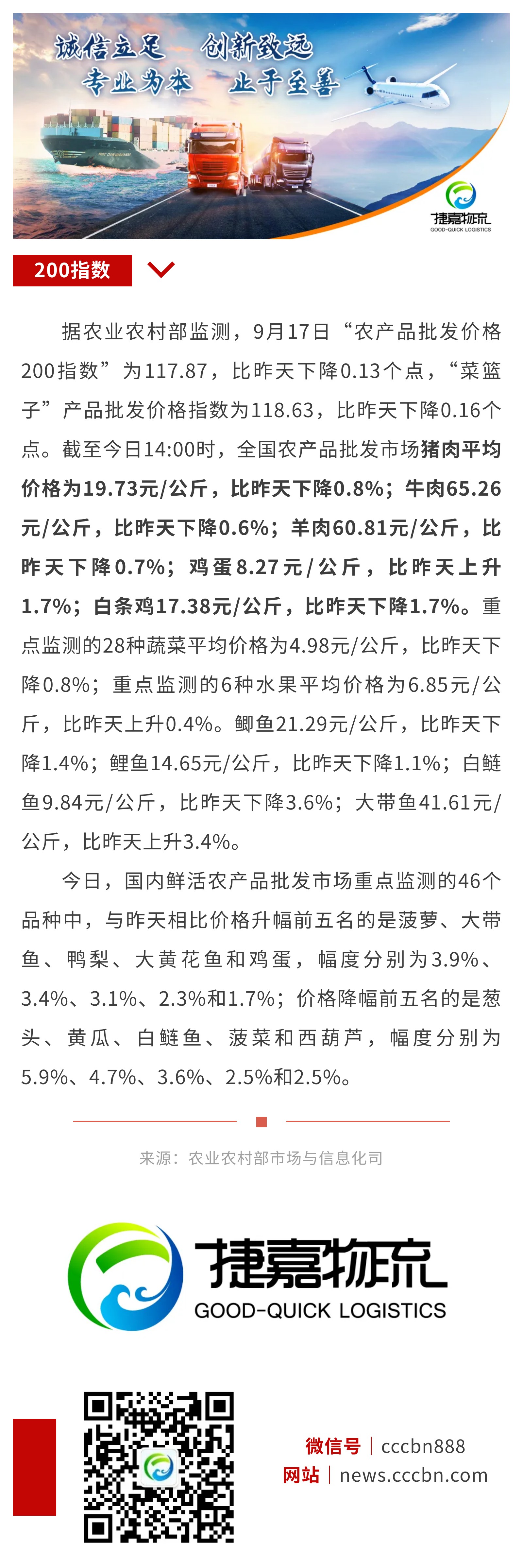 9月17日:“农产品批发价格200指数”比昨天下降0.13个点